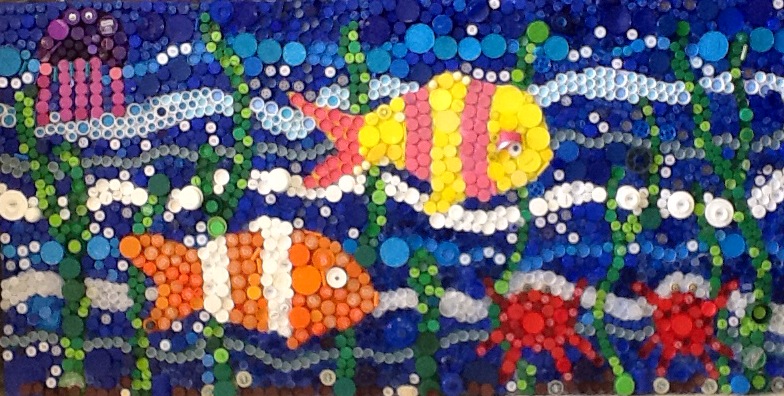 Delaney Davis had the winning mural design, and all grades k-12 participated in collecting and gluing on the plastic bottle caps!